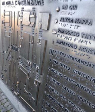 - Plany tyflograficzne i oznaczenia w Braille’uPlany tyflograficzne wielobarwne (wykonane na fazowanym dibondzie) z tworzywa, stalowe, odlewy, makiety, termoformy. Piktogramy, tabliczki przydrzwiowe, nadklamkowe, nakładki na poręcze. Tablice informacyjne z brajlem, dotykowe pomoce naukowe, grafiki, adaptacje dzieł sztuki.